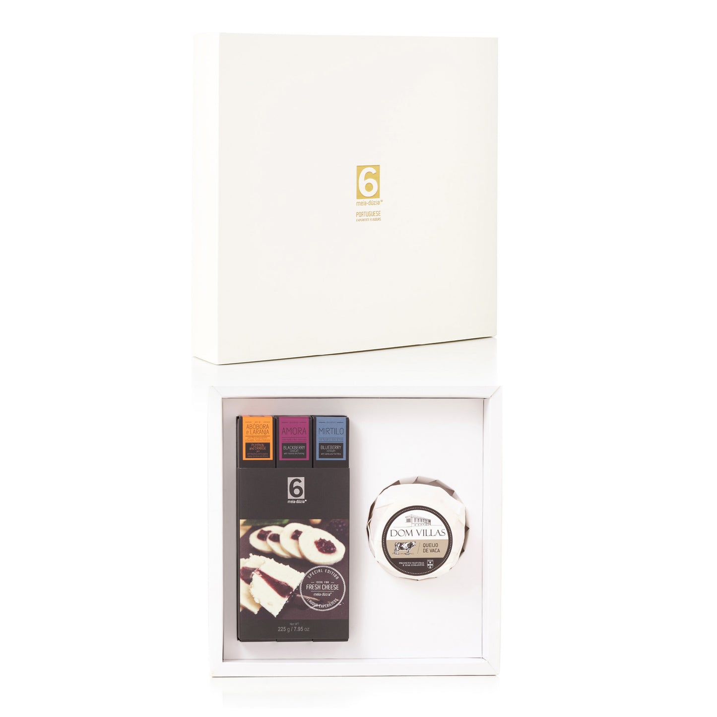 Esta proposta harmoniza um queijo de vaca, com tempo de cura mais reduzida - de textura mais macia e de sabor mais adocicado - a um PACK3 Compotas selecionadas pelo contraste com este queijo, e tanto poderá ter uma experiência mais adocicada e de contraste de méis e especiarias (canela) como uma experiência agridoce devido à acidez dos frutos vermelhos da nossa seleção de sabores.